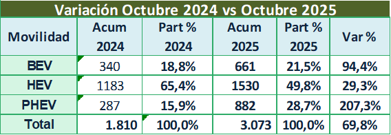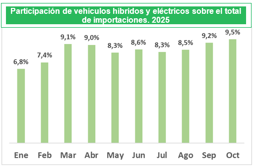 Las importaciones de vehículos híbridos y eléctricos crecieron 70 %, en comparación al mismo periodo de 2024, sumando 3073 unidades en el acumulado del año.