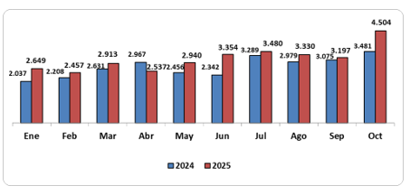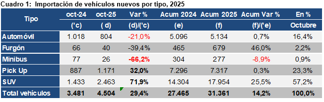 En octubre de 2025, las importaciones de vehículos nuevos alcanzaron 4.504 unidades, frente a las 3.481 registradas en el mismo mes en el año anterior, lo que representa un aumento de 29,40% y el mayor volumen de importaciones en el año.