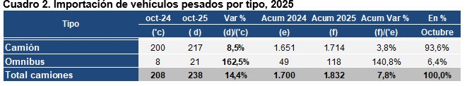 En el segmento de camiones, en el acumulado del año, los camiones y ómnibus alcanzaron 1.832 unidades, con una variación de 7,8% respecto al 2024. Los camiones totalizaron 1.714 unidades, con una variación de 3,8% y los ómnibus llegaron a 118 unidades y una variación de 140,8%.