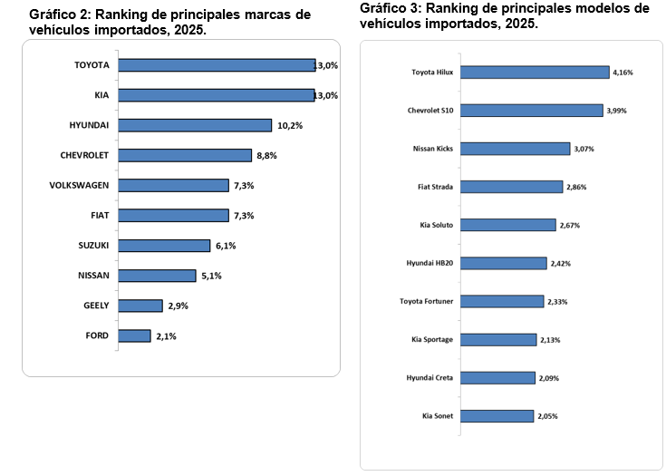 Entre las marcas de mayor volumen de importaciones, en vehículos se encuentran encabezando la lista: Toyota con 13%, Kia con 13%, Hyundai 10,2%, Chevrolet con 8,8%, Volkswagen con 7,3%, Fiat con 7,3%, Suzuki con 6,1%, Nissan con 5,1%, Geely con 2,9% y Ford con 2,1%. Por otra parte, los modelos más importados de vehículos nuevos fueron: Toyota Hilux con el 4,16% del total, seguido por Chevrolet S10 con el 3,99%, Nissan Kicks 3,07%, Fiat Strada 2,86%, Kia Soluto con 2,67%, Hyundai HB20 con 2,42%, Toyota Fortuner con 2,33% y Kia Sportage con 2,13%.