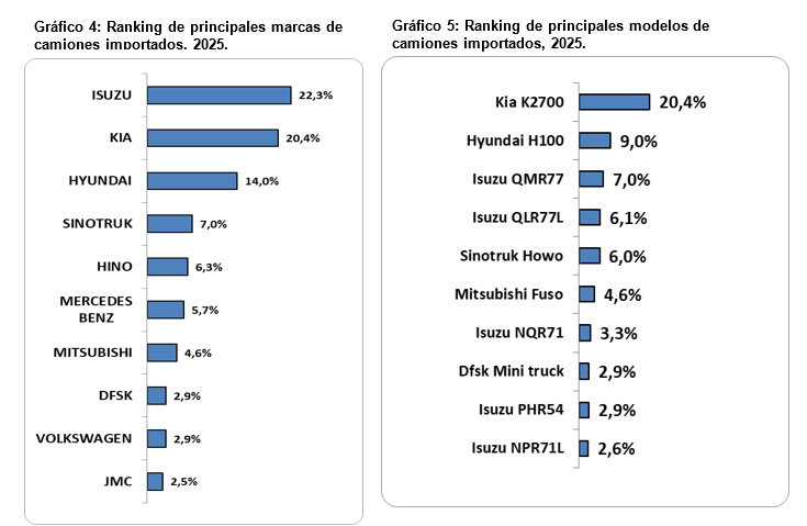 Respecto a camiones, la marca Isuzu lidera con 22,3% de las importaciones, le siguen Kia con 20,4%, Hyundai con 14,0%, Sinotruk con 7,0%, Hino con 6,3% y Mercedes Benz con 5,7%, seguido de Mitsubishi con 4,6%, DFSK con 2,9%, Volkswagen con 2,9% y JMC con 2,5%.