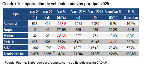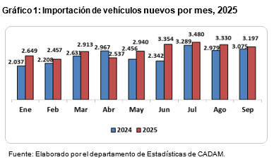 En septiembre de 2025, las importaciones de vehículos nuevos alcanzaron 3.197 unidades, frente a las 3.075 registradas en el mismo mes en el año anterior, lo que representa un aumento de 4%, representado el 8vo. mes del año con variación positiva de las importaciones respecto al año 2024, solo en el mes de abril se dio una disminución.