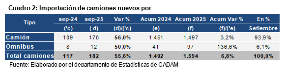 En el segmento de camiones, en el acumulado del año, los camiones y ómnibus alcanzaron 1.594 unidades, con una variación de 6,8% respecto al 2024. Los camiones alcanzaron 1.497 unidades, con una variación de 3,2% y los ómnibus llegaron a 97 unidades y una variación de 136,6%.