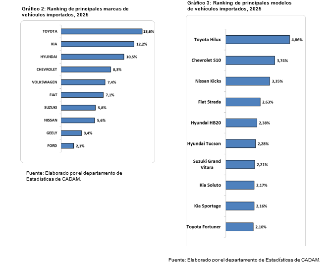 Entre las marcas de mayor volumen de importaciones, en vehículos se encuentran encabezando la lista: Toyota con 13,6%, Kia con 12,2%, Hyundai 10,5%, Chevrolet con 8,3%, Fiat con 6,9% y Volkswagen con 7,4%, entre otros. Por otra parte, los modelos más importados de vehículos nuevos fueron: Toyota Hilux con el 4,86% del total, seguido por Chevrolet S10 con el 3,74%, Nissan Kicks 3,35%, Fiat Strada 2,63% y Hyundai HB20 con 2,38%.