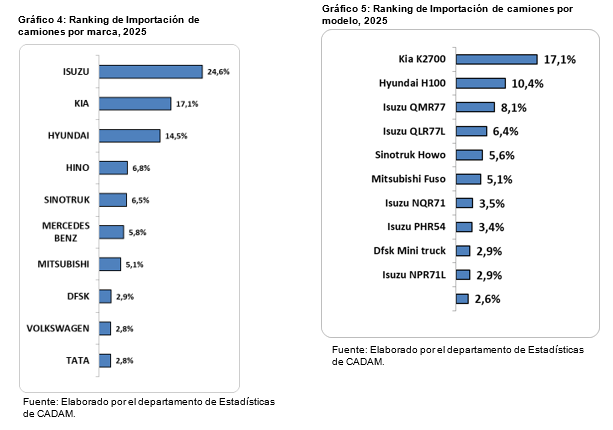 Respecto a camiones, la marca Isuzu lidera con 24,6% de las importaciones, le siguen Kia con 17,1%, Hyundai con 14,5%, Hino con 6,8%, Sinotruk con 6,5% y Mercedes Benz con 5,8%.