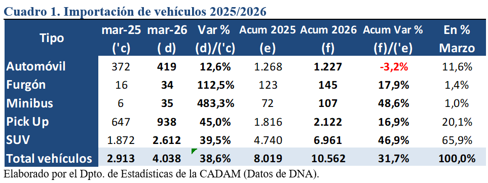 Al mes de marzo, las importaciones de vehículos nuevos alcanzaron un total de 10.562 unidades, lo que representa un crecimiento del 31,7% en comparación con el mismo periodo del año anterior. Solo en el mes de marzo se importaron 4.038 unidades.